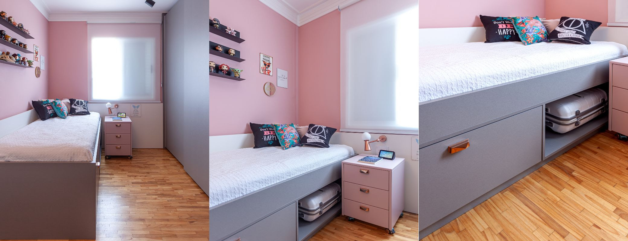 A arquiteta adaptou diferentes soluções em dormitórios infantis e juvenis. Em um projeto sem distinção de gênero para irmãos, optou por duas camas de madeira com proteção lateral. Já em um quarto para adolescente, desenvolveu cama com marcenaria sob medida, que inclui gavetão e nicho para organização.