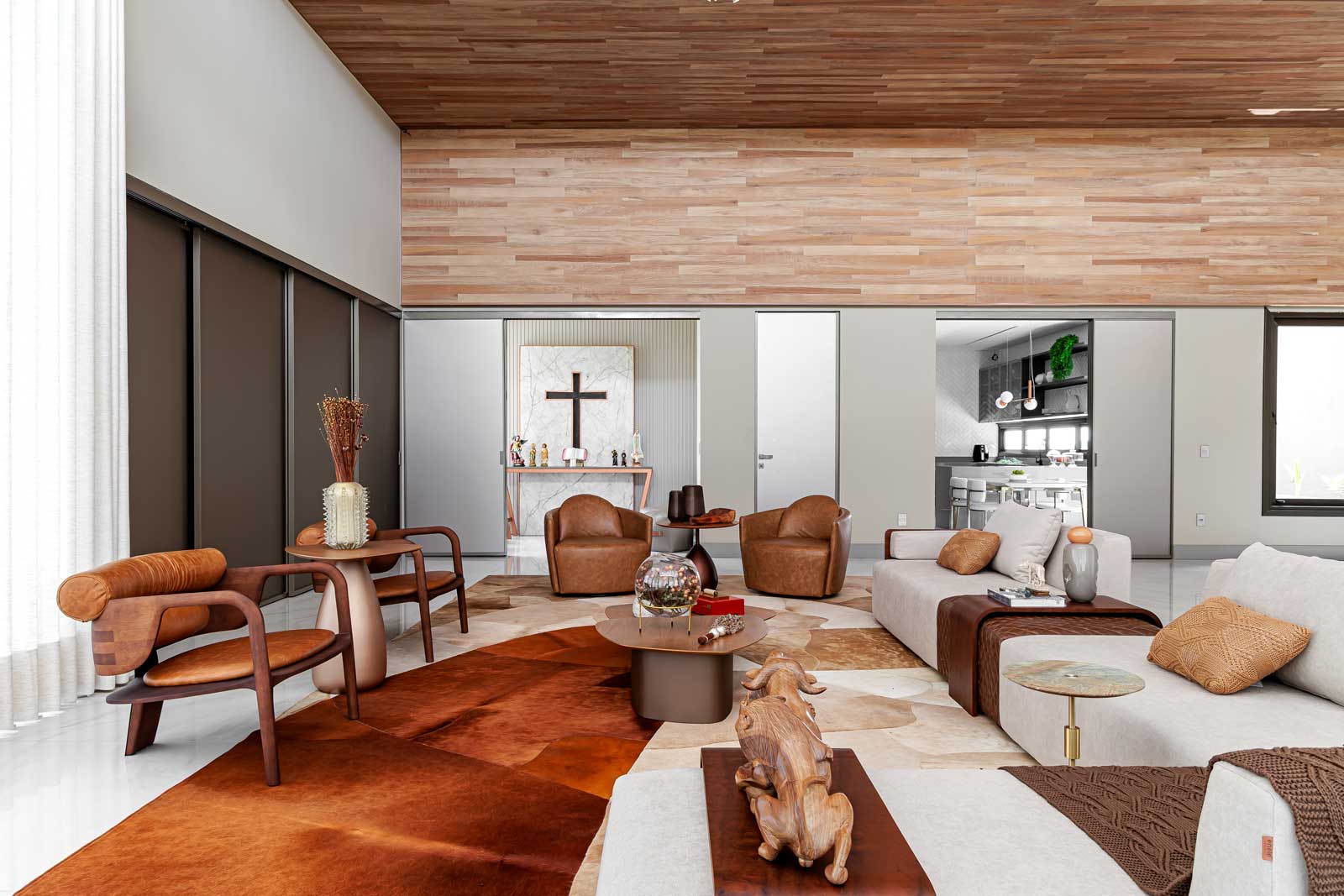 O projeto valoriza o aconchego sem abrir mão da imponência, com soluções sob medida que reforçam o caráter afetivo do espaço. Um dos elementos centrais é o painel em teto vinílico de acabamento amadeirado, desenvolvido pela Talt em parceria com o escritório Doma Arquitetura. Ele percorre teto e parede, criando uma moldura contínua para o mobiliário orgânico e a paleta de cores terrosas – que vai do off-white ao marrom.