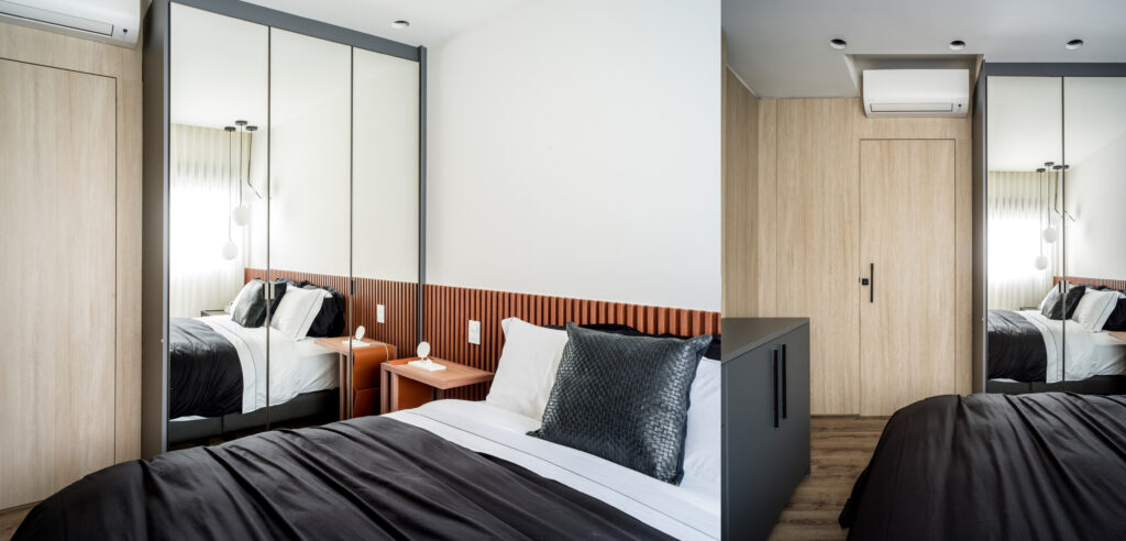 No quarto, o projeto priorizou conforto e amplitude visual. Espelhos ajudam a refletir a luz natural e ampliam a percepção de espaço. Um painel liso cria um efeito de moldura ao redor da entrada do dormitório e da parede da TV, deixando o ambiente mais intimista. A porta mimetizada no painel mantém o visual limpo, enquanto a cabeceira ripada retoma a identidade presente em outros ambientes da casa. O resultado é um apartamento compacto, mas com soluções inteligentes que valorizam a metragem e criam um espaço equilibrado entre estilo e funcionalidade.